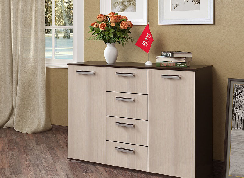 Простые линии, классические формы «оживляются» сочетанием контрастных цветов. Комод «Стандарт 2» станет отличным решением для оформления помещений любого назначения, будь то спальня в городской квартире, прихожая в загородном доме или гостиничный номер. Отдельного внимания достойна также и низкая цена, которая никоим образом не отражается на качестве комода — впрочем, любая корпусная мебель от BTS может похвастать этим достоинством. Материал: ЛДСП. Цвет: венге/лоредо. Габариты (ШхВхГ) 1200х870х440